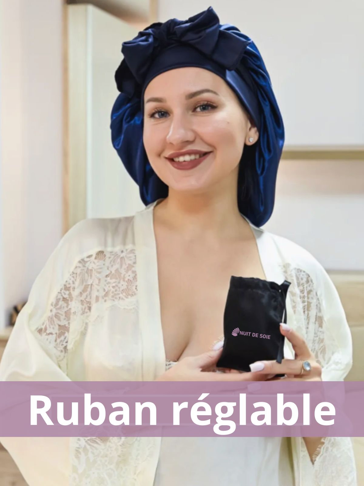 Grâce à son ruban ajustable, ce bonnet s’adapte à toutes les tailles de tête sans jamais comprimer. Il reste en place toute la nuit, même en bougeant, pour un confort optimal et une tenue personnalisée.